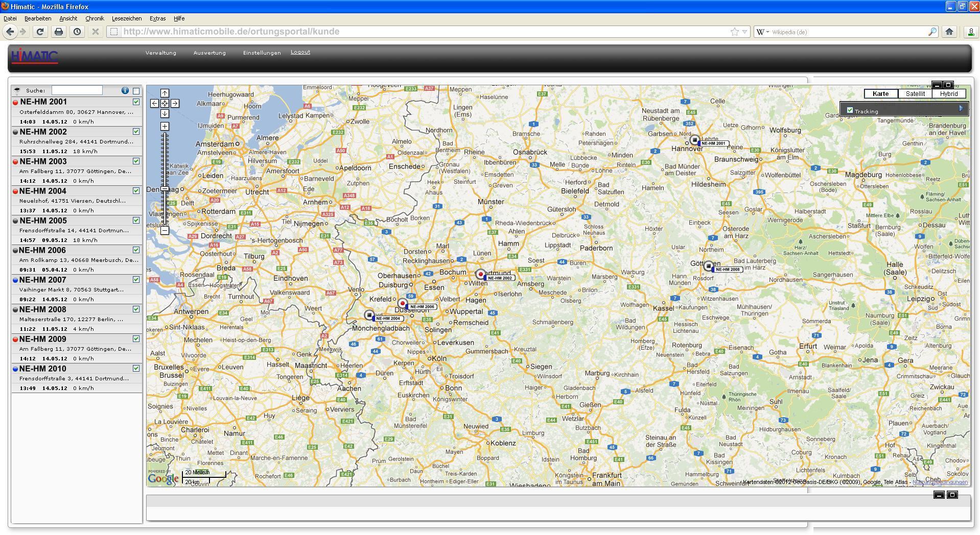 HIMATIC Profi sendet die Positionsdaten, den Betriebszustand (Zündung an/aus) an das Webportal. Diese Daten werden in einem festgelegten Zeitintervall auf dem Webportal aktualisiert und stehen dem Betrachter zur Verfügung. So können Sie live verfolgen an welcher Position sich das Fahrzeug befindet und in welchem Betriebszustand es gerade ist. Damit ist HIMATIC Profi ideal geeignet z.B. für Speditionen, Lieferfahrzeuge oder Servicetechniker.
